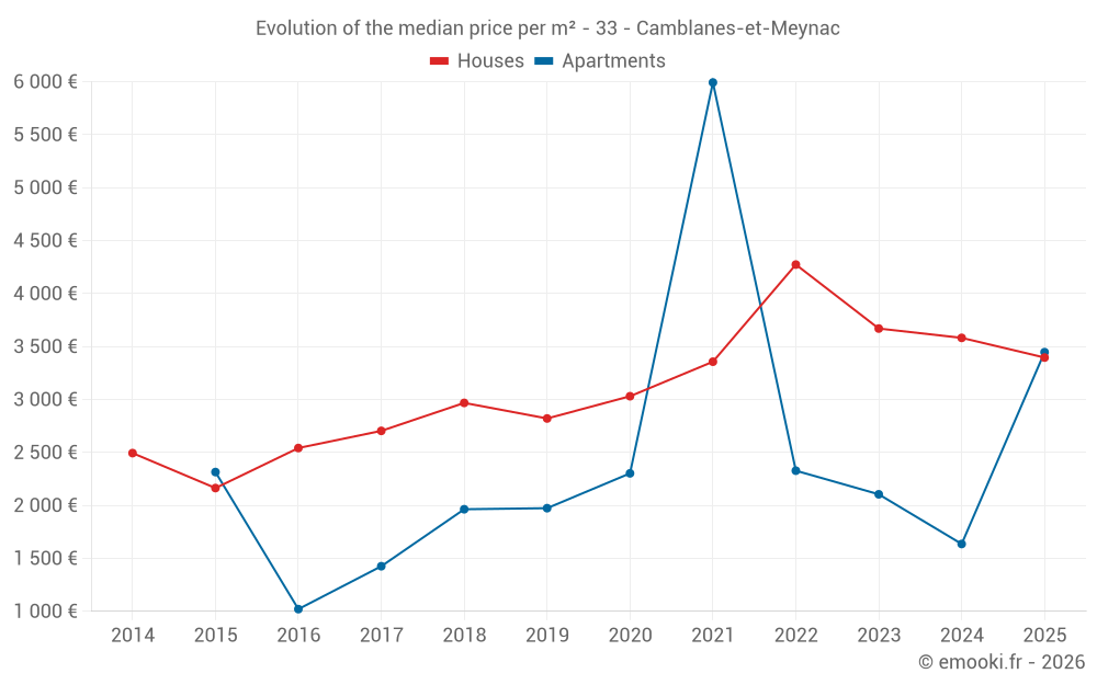 The median price on the 24 house transactions of the last 12 months in the municipality of Camblanes-et-Meynac was 3 565 € per square meter for a median property value of 299 200 €. Over this period, 60% of transactions were between 2 417 and 4 070 € per square meter (from the 2nd to the 8th deciles).