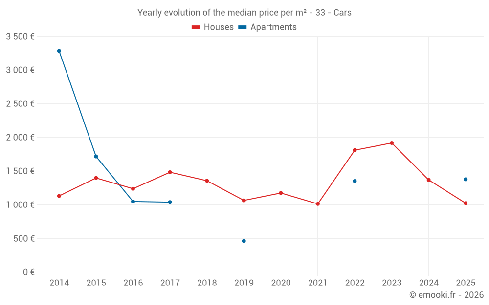 The median price on the 25 house transactions of the last 24 months in the municipality of Cars was 1 563 € per square meter for a median property value of 166 000 €. Over this period, 60% of transactions were between 1 239 and 2 204 € per square meter (from the 2nd to the 8th deciles).