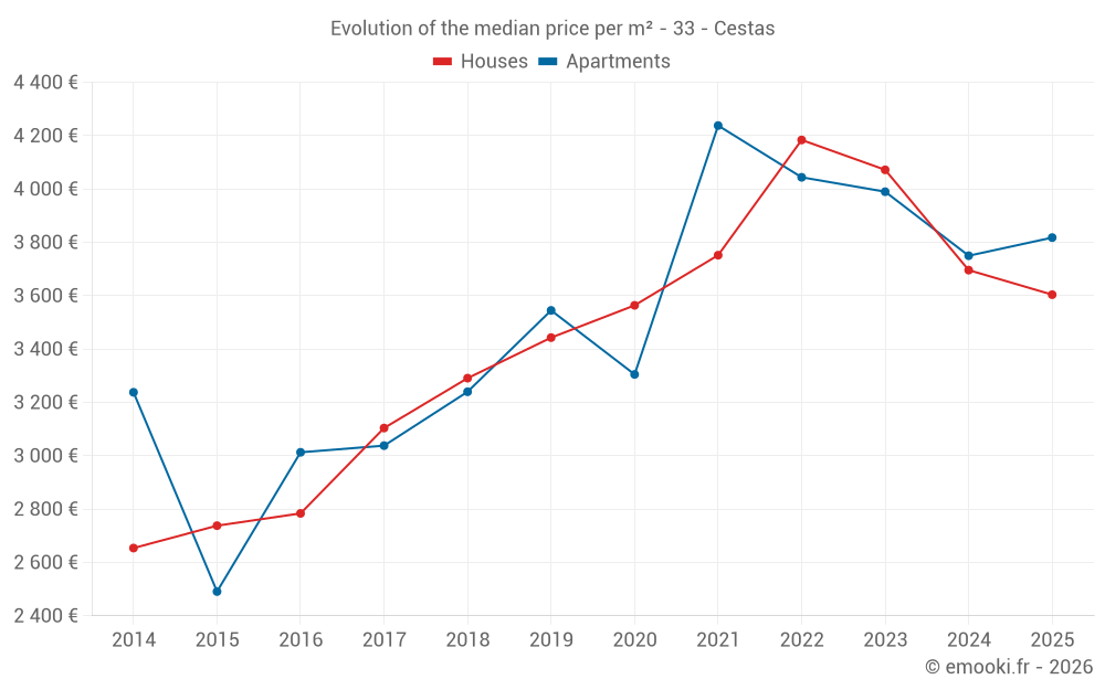 The median price on the 38 house transactions of the last 6 months in the municipality of Cestas was 3 604 € per square meter for a median property value of 344 590 €. Over this period, 60% of transactions were between 2 679 and 4 136 € per square meter (from the 2nd to the 8th deciles).