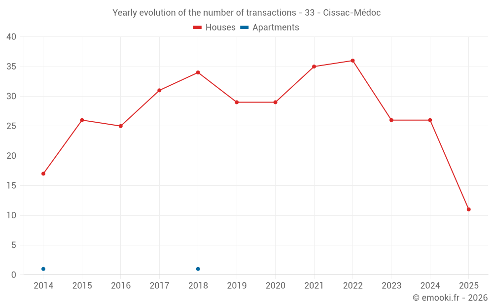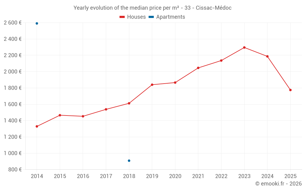 The median price on the 26 house transactions of the last 12 months in the municipality of Cissac-Médoc was 2 081 € per square meter for a median property value of 200 725 €. Over this period, 60% of transactions were between 1 268 and 2 369 € per square meter (from the 2nd to the 8th deciles).