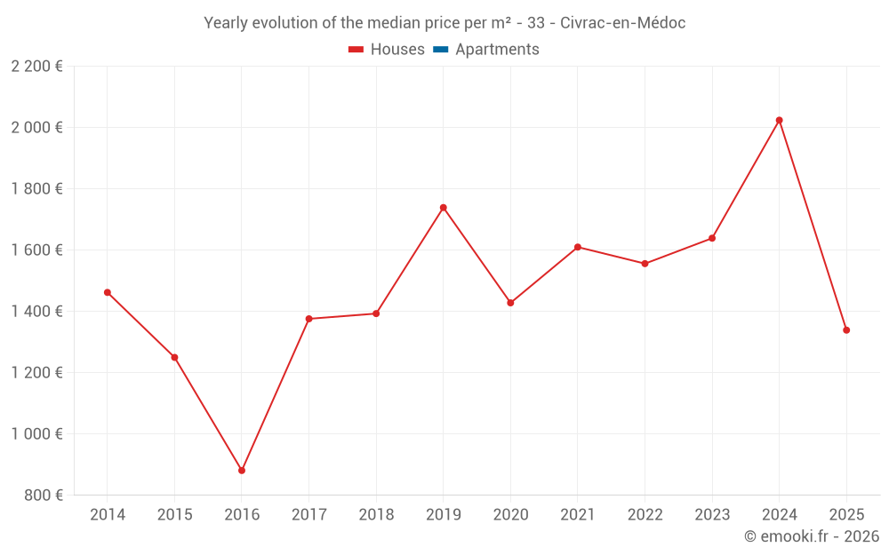 The median price on the 23 house transactions of the last 24 months in the municipality of Civrac-en-Médoc was 1 650 € per square meter for a median property value of 170 000 €. Over this period, 60% of transactions were between 1 098 and 2 281 € per square meter (from the 2nd to the 8th deciles).