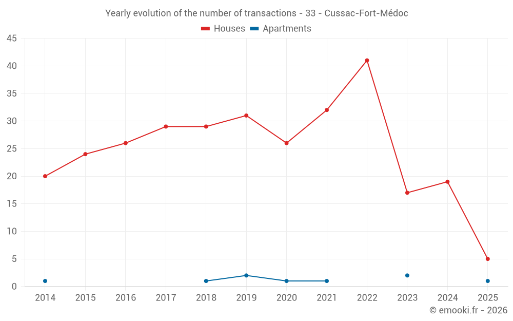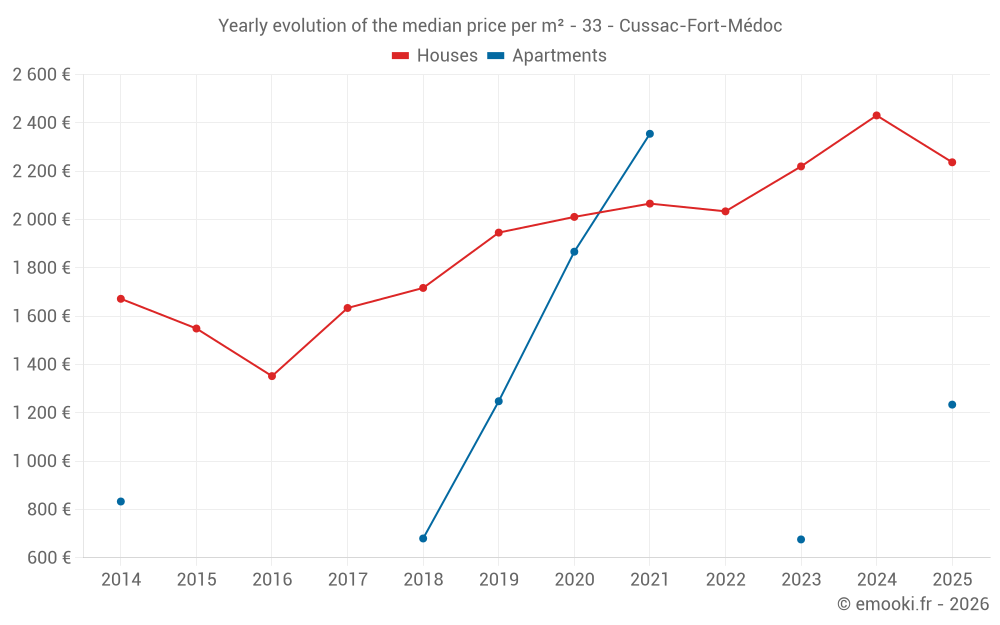 The median price on the 16 house transactions of the last 12 months in the municipality of Cussac-Fort-Médoc was 2 413 € per square meter for a median property value of 215 505 €. Over this period, 60% of transactions were between 1 867 and 2 755 € per square meter (from the 2nd to the 8th deciles).