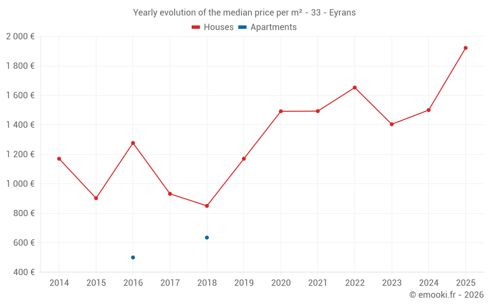The median price on the 18 house transactions of the last 24 months in the municipality of Eyrans was 1 526 € per square meter for a median property value of 170 000 €. Over this period, 60% of transactions were between 1 100 and 2 082 € per square meter (from the 2nd to the 8th deciles).