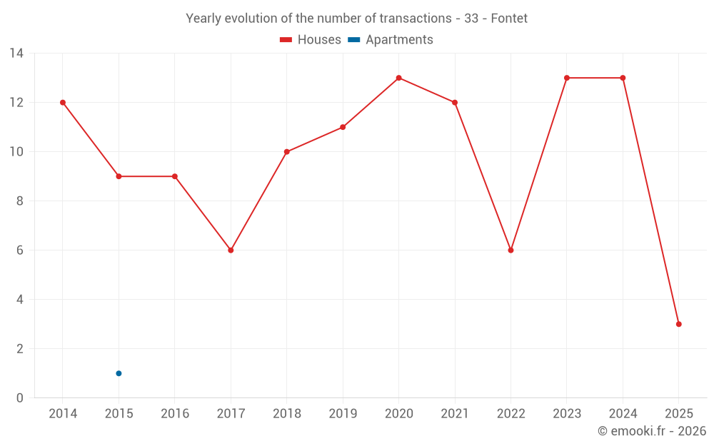 The median price on the 23 house transactions of the last 24 months in the municipality of Fontet was 1 359 € per square meter for a median property value of 155 360 €. Over this period, 60% of transactions were between 715 and 1 802 € per square meter (from the 2nd to the 8th deciles).