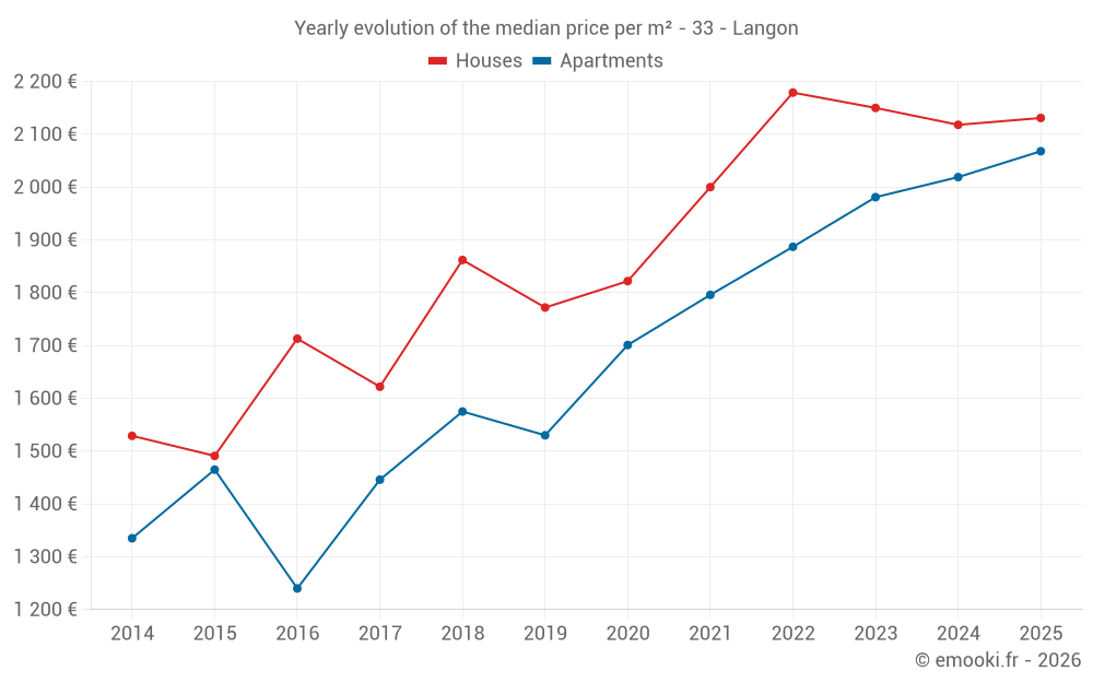The median price on the 30 house transactions of the last 6 months in the municipality of Langon was 2 131 € per square meter for a median property value of 202 000 €. Over this period, 60% of transactions were between 1 774 and 2 607 € per square meter (from the 2nd to the 8th deciles).