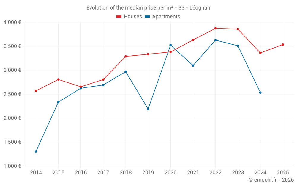 The median price on the 39 house transactions of the last 6 months in the municipality of Léognan was 3 533 € per square meter for a median property value of 325 000 €. Over this period, 60% of transactions were between 2 518 and 4 039 € per square meter (from the 2nd to the 8th deciles).