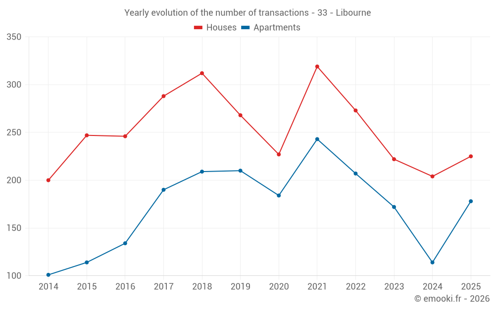 The median price on the 63 house transactions of the last 3 months in the municipality of Libourne was 2 528 € per square meter for a median property value of 194 000 €. Over this period, 60% of transactions were between 1 832 and 2 955 € per square meter (from the 2nd to the 8th deciles).