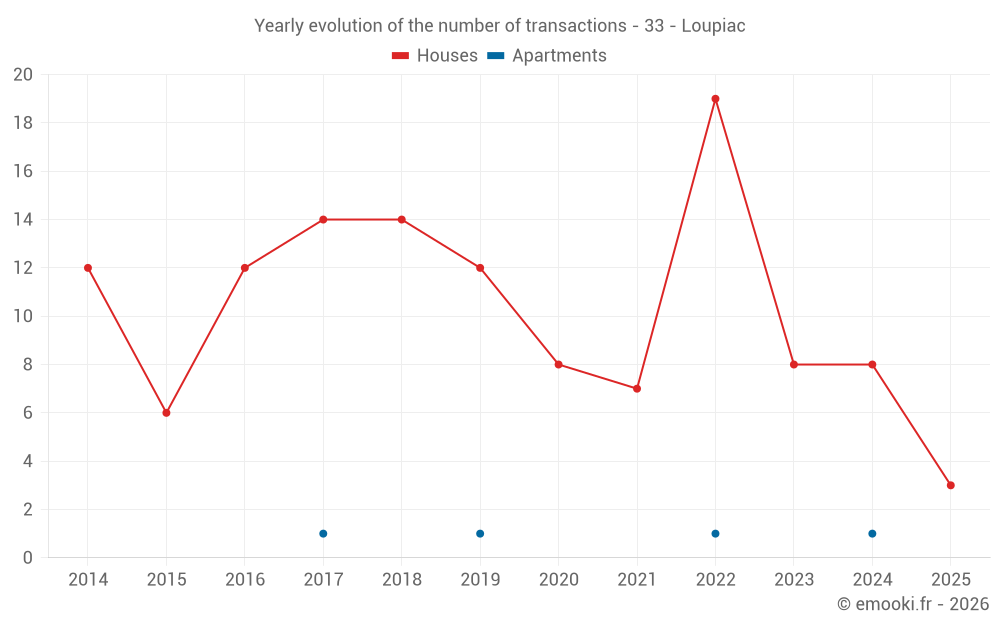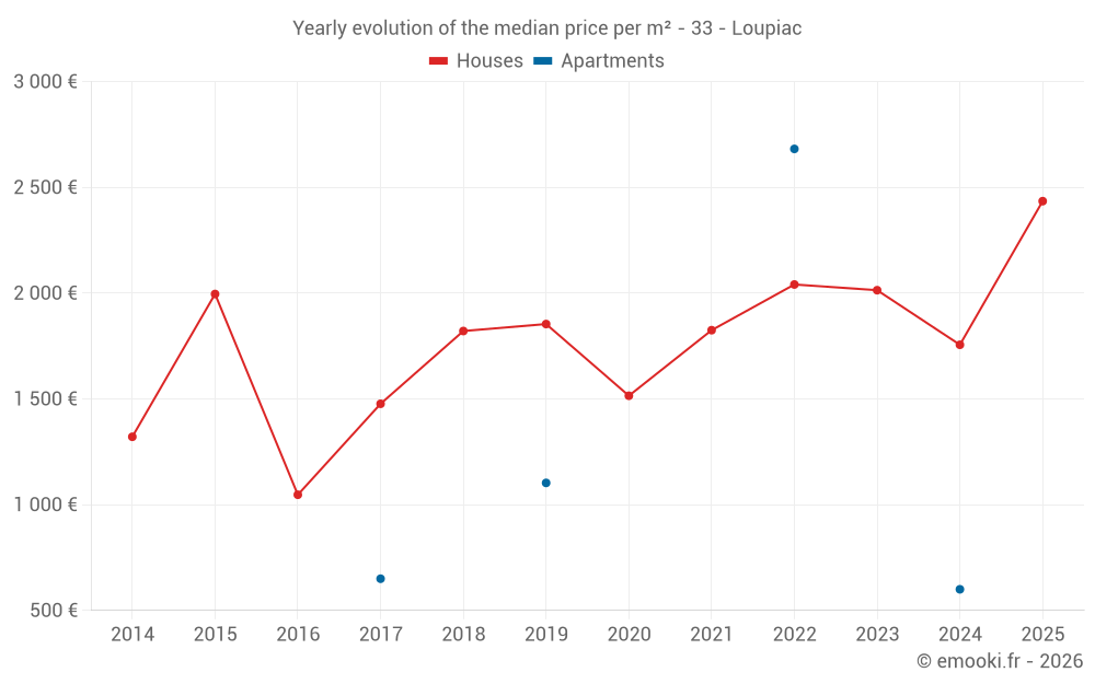 The median price on the 15 house transactions of the last 24 months in the municipality of Loupiac was 2 029 € per square meter for a median property value of 216 700 €. Over this period, 60% of transactions were between 1 404 and 2 616 € per square meter (from the 2nd to the 8th deciles).