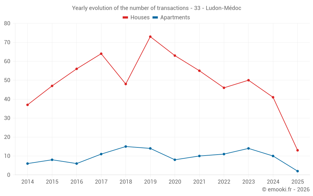 The median price on the 14 apartment transactions of the last 24 months in the municipality of Ludon-Médoc was 2 331 € per square meter for a median property value of 165 500 €. Over this period, 60% of transactions were between 1 359 and 2 662 € per square meter (from the 2nd to the 8th deciles).