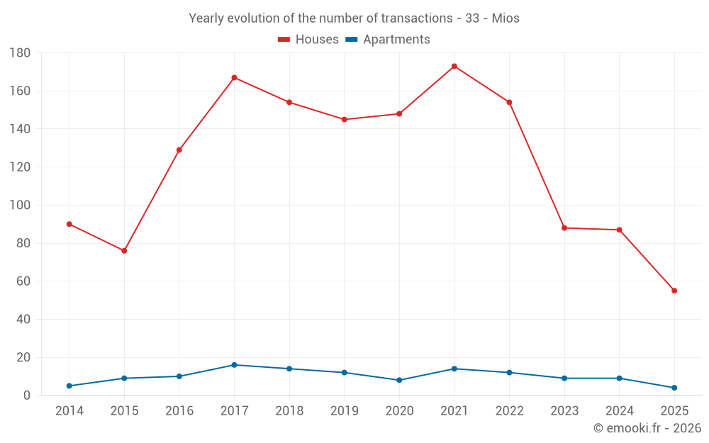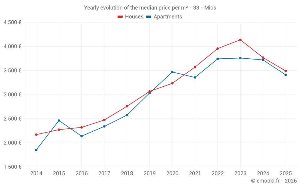 The median price on the 16 apartment transactions of the last 24 months in the municipality of Mios was 3 718 € per square meter for a median property value of 193 198 €. Over this period, 60% of transactions were between 3 333 and 4 200 € per square meter (from the 2nd to the 8th deciles).