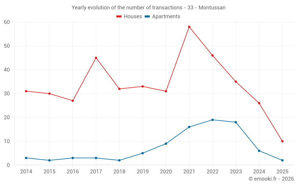 The median price on the 20 apartment transactions of the last 24 months in the municipality of Montussan was 3 066 € per square meter for a median property value of 133 000 €. Over this period, 60% of transactions were between 2 806 and 3 229 € per square meter (from the 2nd to the 8th deciles).