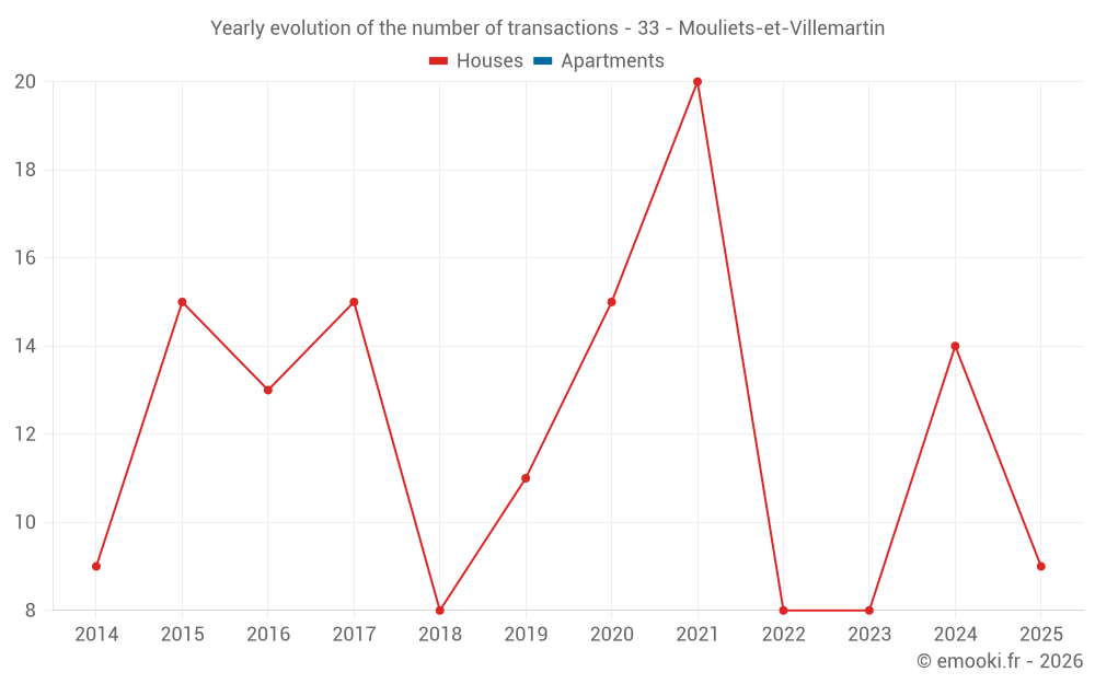The median price on the 16 house transactions of the last 12 months in the municipality of Mouliets-et-Villemartin was 1 698 € per square meter for a median property value of 147 500 €. Over this period, 60% of transactions were between 833 and 2 125 € per square meter (from the 2nd to the 8th deciles).