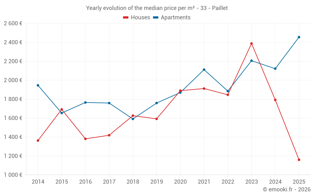 The median price on the 23 house transactions of the last 24 months in the municipality of Paillet was 1 898 € per square meter for a median property value of 224 000 €. Over this period, 60% of transactions were between 1 261 and 2 988 € per square meter (from the 2nd to the 8th deciles).