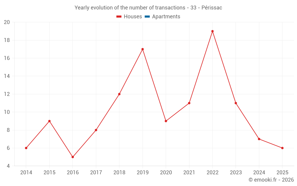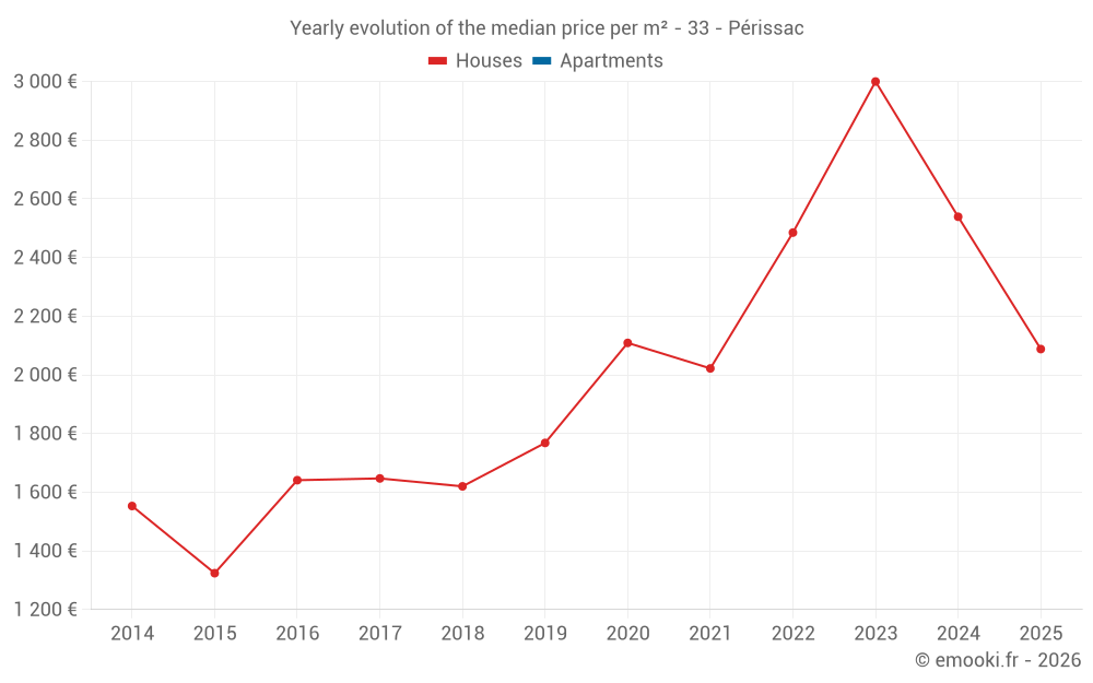 The median price on the 17 house transactions of the last 24 months in the municipality of Périssac was 2 370 € per square meter for a median property value of 219 048 €. Over this period, 60% of transactions were between 1 704 and 3 129 € per square meter (from the 2nd to the 8th deciles).
