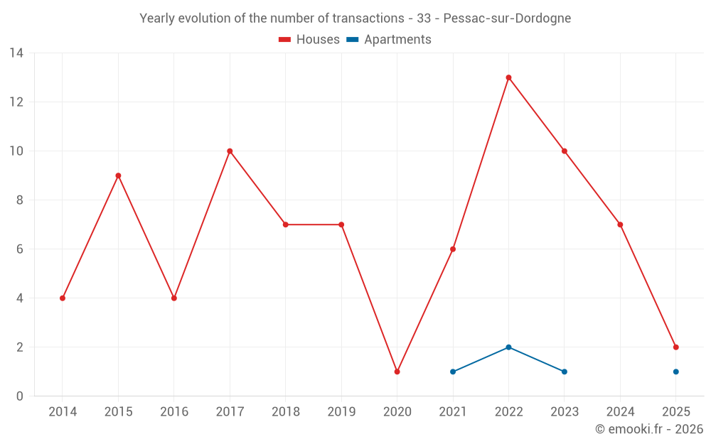 The median price on the 14 house transactions of the last 24 months in the municipality of Pessac-sur-Dordogne was 1 642 € per square meter for a median property value of 152 342 €. Over this period, 60% of transactions were between 1 062 and 2 892 € per square meter (from the 2nd to the 8th deciles).
