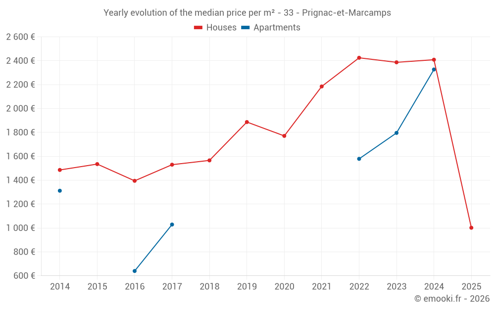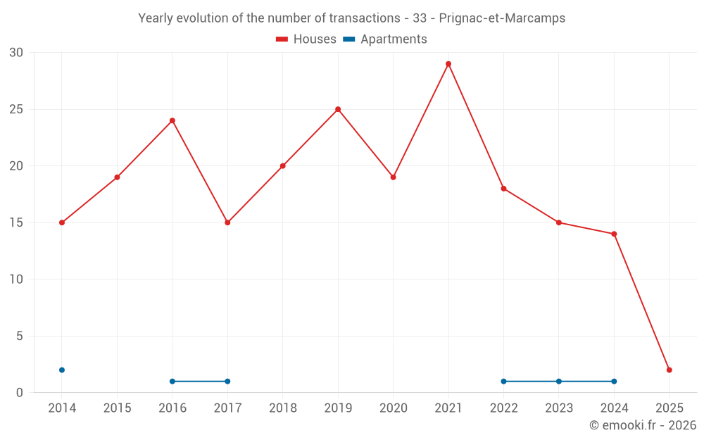 The median price on the 22 house transactions of the last 24 months in the municipality of Prignac-et-Marcamps was 2 378 € per square meter for a median property value of 228 250 €. Over this period, 60% of transactions were between 2 017 and 2 817 € per square meter (from the 2nd to the 8th deciles).