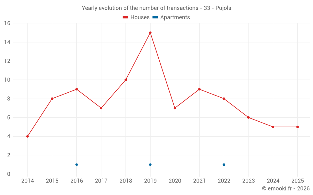 The median price on the 15 house transactions of the last 24 months in the municipality of Pujols was 1 587 € per square meter for a median property value of 180 000 €. Over this period, 60% of transactions were between 841 and 2 411 € per square meter (from the 2nd to the 8th deciles).