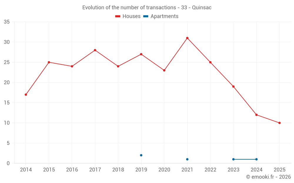 The median price on the 17 house transactions of the last 12 months in the municipality of Quinsac was 3 402 € per square meter for a median property value of 400 000 €. Over this period, 60% of transactions were between 2 664 and 4 300 € per square meter (from the 2nd to the 8th deciles).