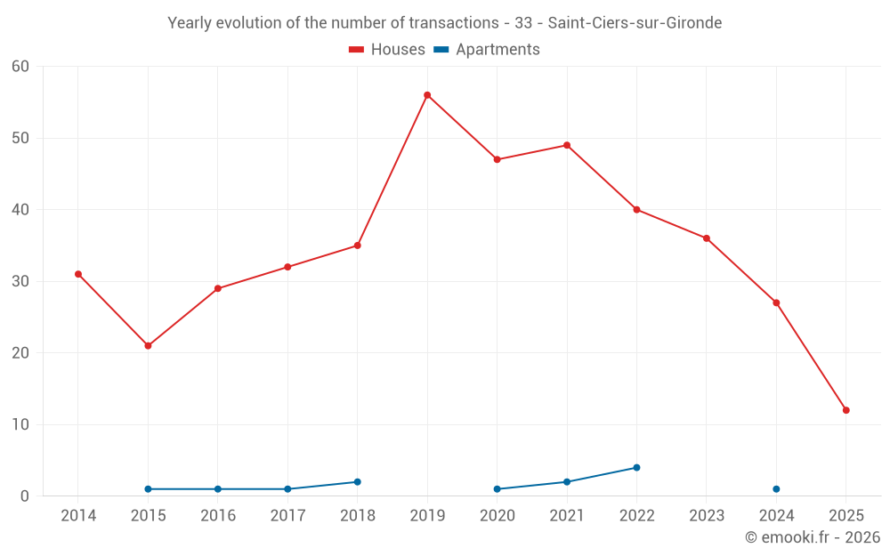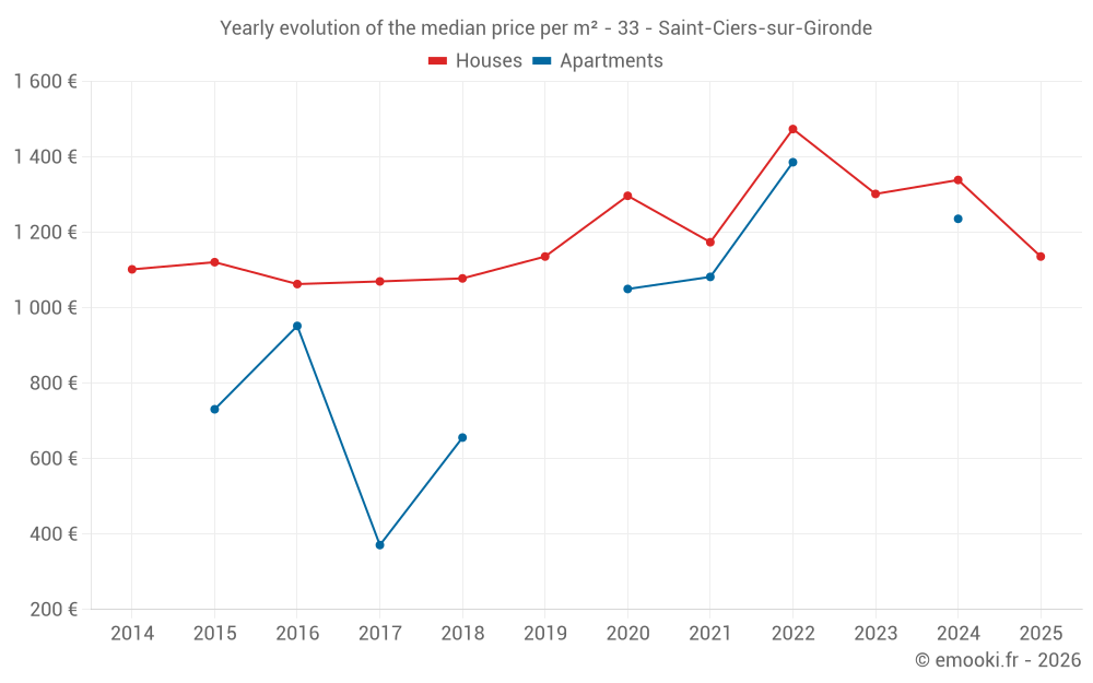 The median price on the 28 house transactions of the last 12 months in the municipality of Saint-Ciers-sur-Gironde was 1 416 € per square meter for a median property value of 139 500 €. Over this period, 60% of transactions were between 966 and 1 797 € per square meter (from the 2nd to the 8th deciles).