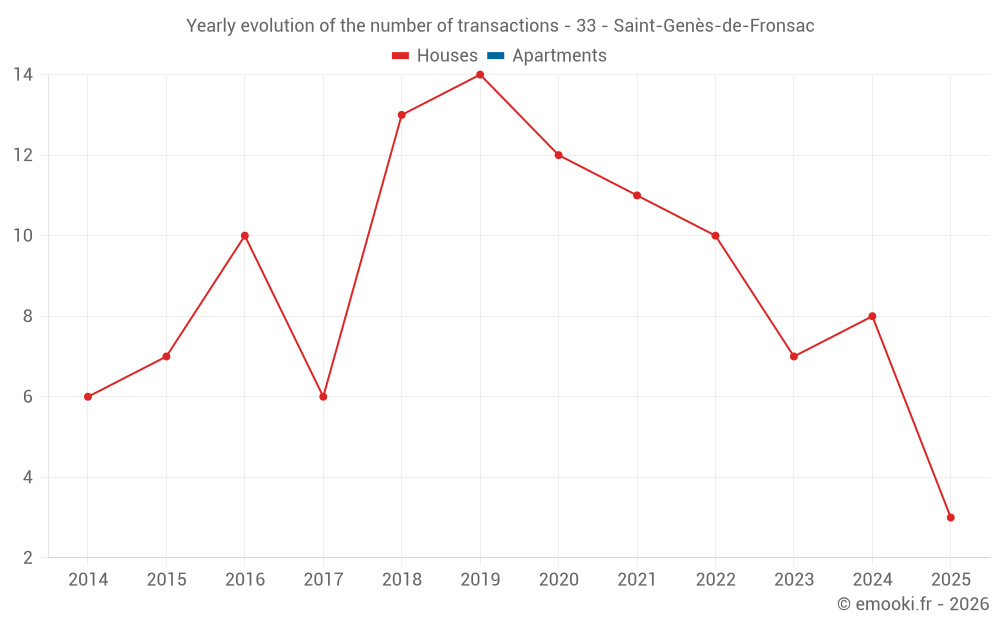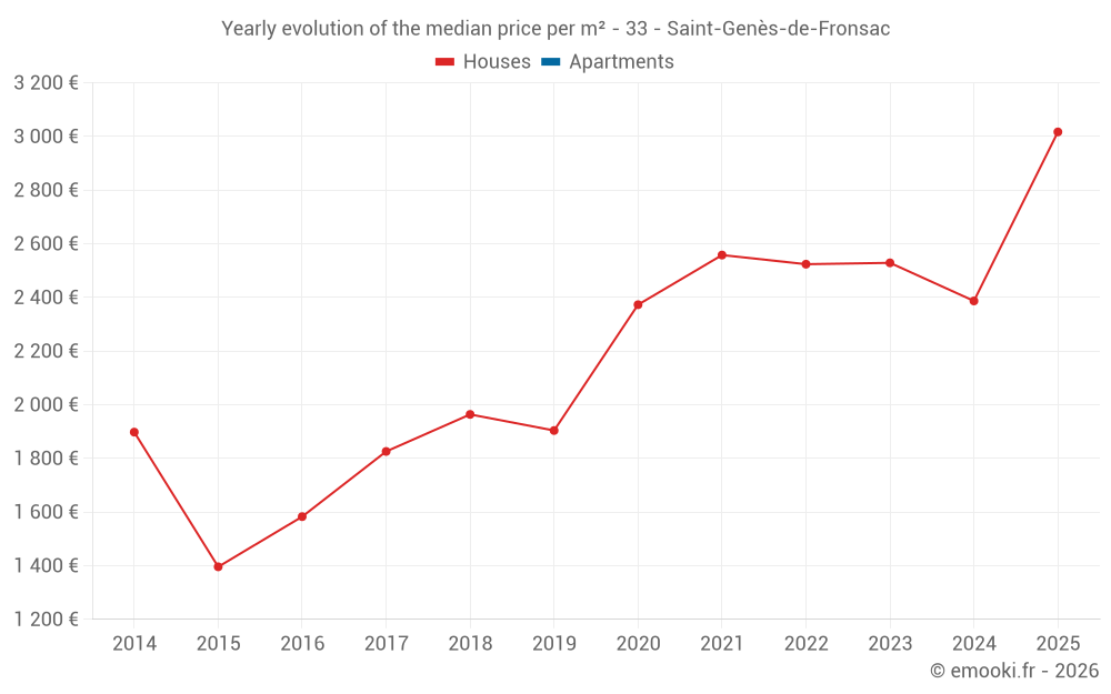 The median price on the 16 house transactions of the last 24 months in the municipality of Saint-Genès-de-Fronsac was 2 431 € per square meter for a median property value of 267 500 €. Over this period, 60% of transactions were between 1 647 and 3 024 € per square meter (from the 2nd to the 8th deciles).