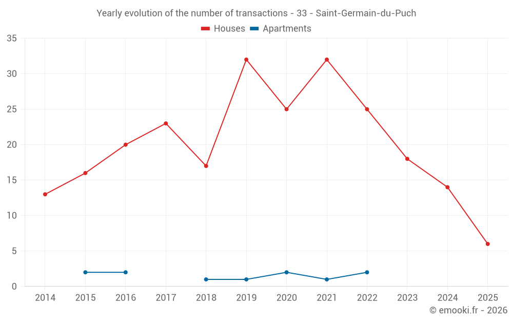 The median price on the 29 house transactions of the last 24 months in the municipality of Saint-Germain-du-Puch was 2 596 € per square meter for a median property value of 272 610 €. Over this period, 60% of transactions were between 1 622 and 3 141 € per square meter (from the 2nd to the 8th deciles).