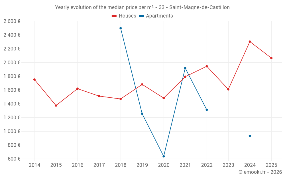 The median price on the 24 house transactions of the last 12 months in the municipality of Saint-Magne-de-Castillon was 2 374 € per square meter for a median property value of 202 250 €. Over this period, 60% of transactions were between 1 751 and 3 124 € per square meter (from the 2nd to the 8th deciles).