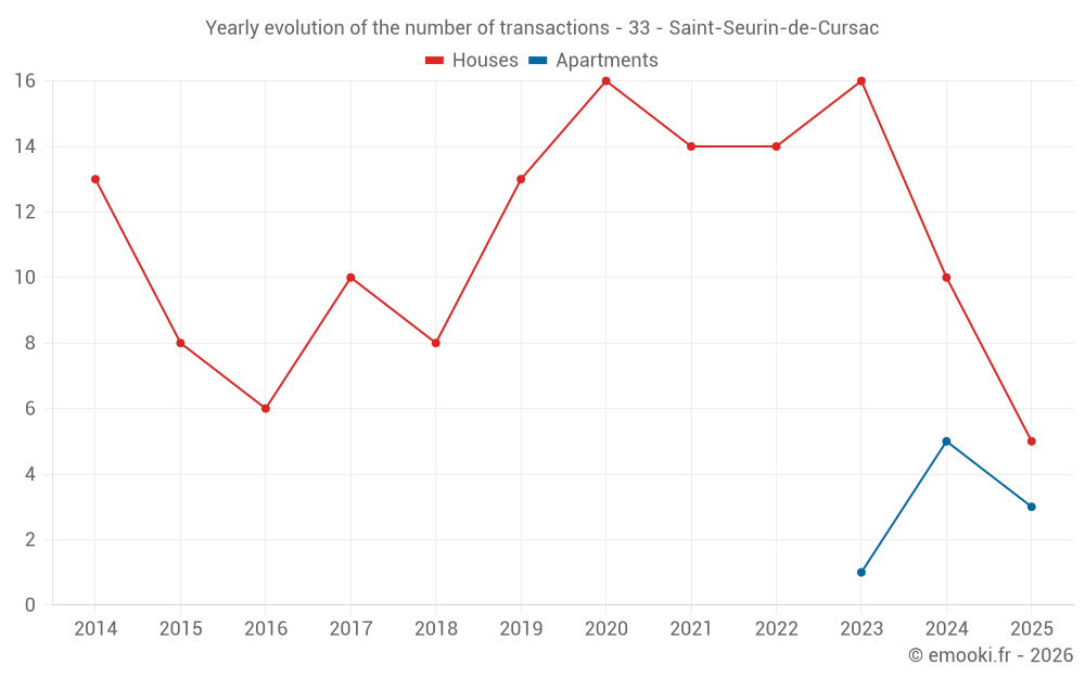 The median price on the 22 house transactions of the last 24 months in the municipality of Saint-Seurin-de-Cursac was 1 626 € per square meter for a median property value of 141 250 €. Over this period, 60% of transactions were between 948 and 1 999 € per square meter (from the 2nd to the 8th deciles).