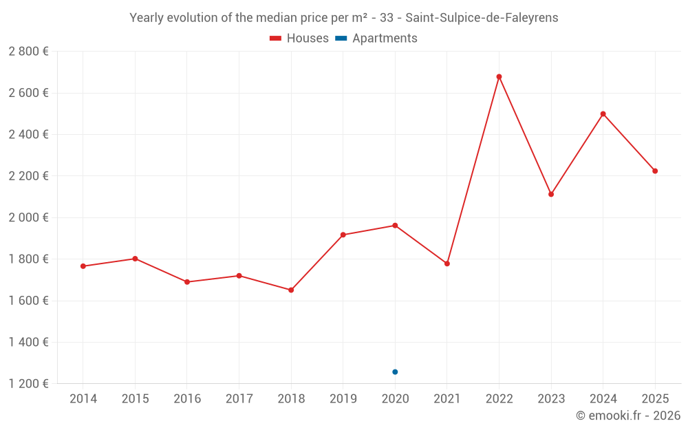 The median price on the 20 house transactions of the last 24 months in the municipality of Saint-Sulpice-de-Faleyrens was 2 195 € per square meter for a median property value of 205 000 €. Over this period, 60% of transactions were between 1 653 and 3 163 € per square meter (from the 2nd to the 8th deciles).