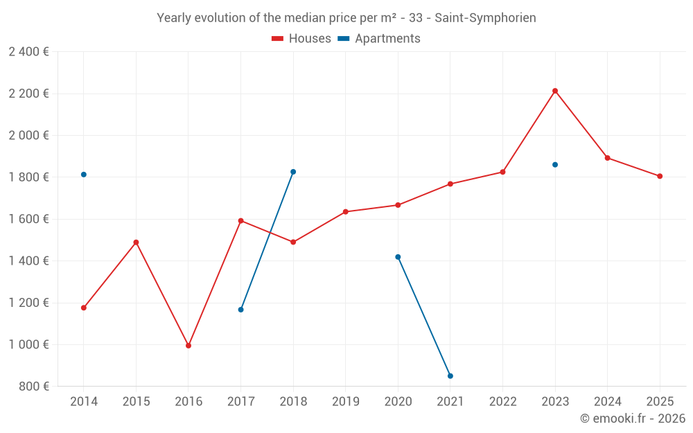 The median price on the 20 house transactions of the last 12 months in the municipality of Saint-Symphorien was 1 805 € per square meter for a median property value of 187 500 €. Over this period, 60% of transactions were between 1 149 and 2 516 € per square meter (from the 2nd to the 8th deciles).