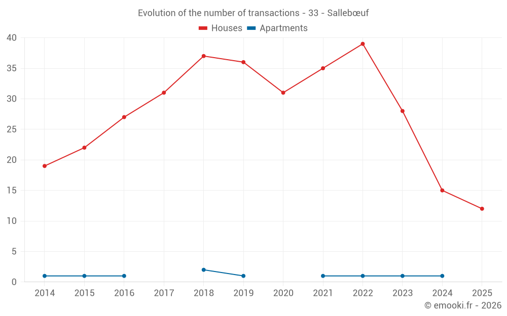 The median price on the 22 house transactions of the last 12 months in the municipality of Sallebœuf was 3 161 € per square meter for a median property value of 350 500 €. Over this period, 60% of transactions were between 2 077 and 3 835 € per square meter (from the 2nd to the 8th deciles).