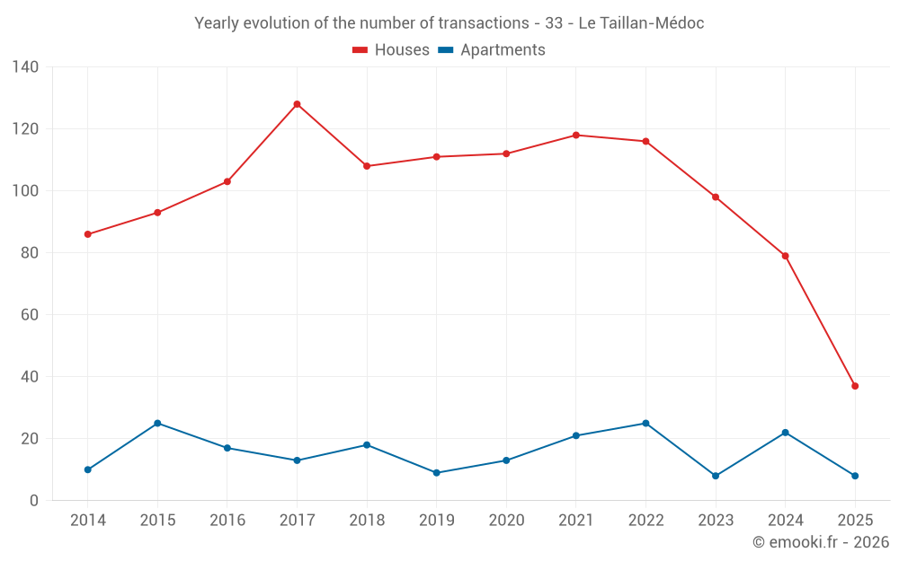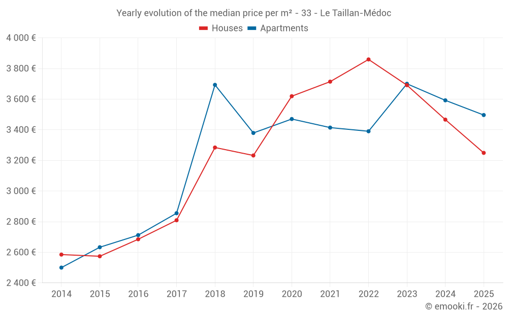 The median price on the 37 house transactions of the last 6 months in the municipality of Le Taillan-Médoc was 3 249 € per square meter for a median property value of 310 000 €. Over this period, 60% of transactions were between 2 068 and 3 749 € per square meter (from the 2nd to the 8th deciles).