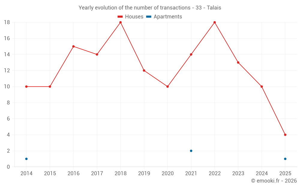 The median price on the 22 house transactions of the last 24 months in the municipality of Talais was 2 024 € per square meter for a median property value of 207 500 €. Over this period, 60% of transactions were between 1 773 and 2 864 € per square meter (from the 2nd to the 8th deciles).