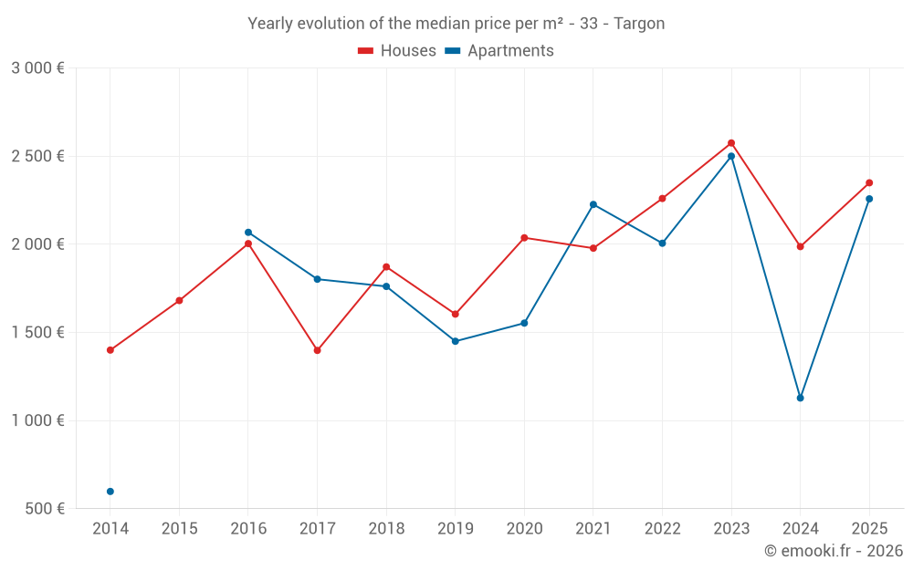 The median price on the 33 house transactions of the last 24 months in the municipality of Targon was 2 329 € per square meter for a median property value of 242 900 €. Over this period, 60% of transactions were between 1 446 and 2 705 € per square meter (from the 2nd to the 8th deciles).