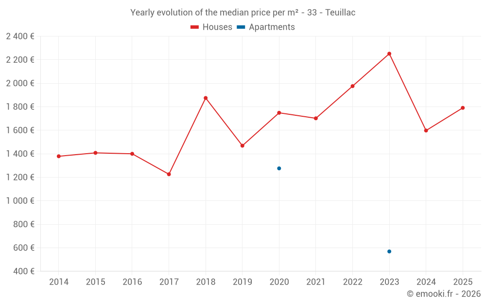 The median price on the 19 house transactions of the last 24 months in the municipality of Teuillac was 2 179 € per square meter for a median property value of 216 170 €. Over this period, 60% of transactions were between 1 484 and 2 558 € per square meter (from the 2nd to the 8th deciles).