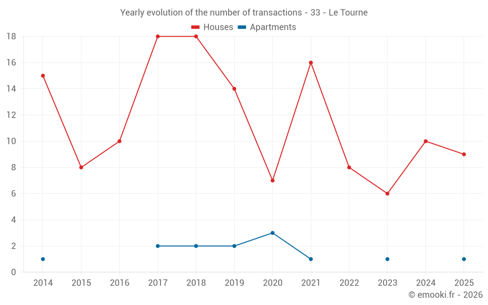 The median price on the 22 house transactions of the last 24 months in the municipality of Le Tourne was 2 176 € per square meter for a median property value of 191 580 €. Over this period, 60% of transactions were between 1 245 and 3 062 € per square meter (from the 2nd to the 8th deciles).