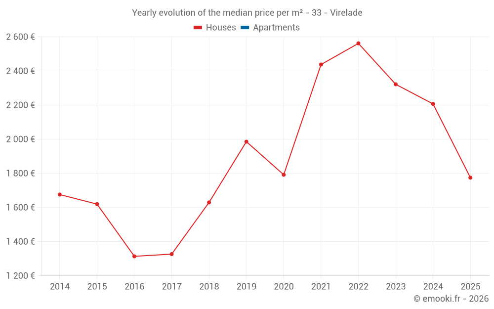 The median price on the 18 house transactions of the last 24 months in the municipality of Virelade was 2 307 € per square meter for a median property value of 224 500 €. Over this period, 60% of transactions were between 1 692 and 2 926 € per square meter (from the 2nd to the 8th deciles).