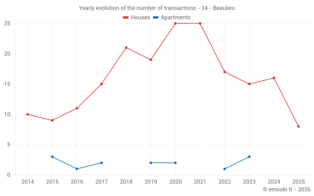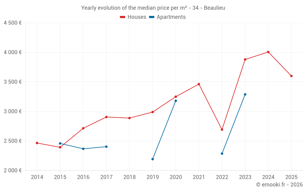 The median price on the 18 house transactions of the last 12 months in the municipality of Beaulieu was 3 964 € per square meter for a median property value of 397 300 €. Over this period, 60% of transactions were between 2 819 and 4 519 € per square meter (from the 2nd to the 8th deciles).