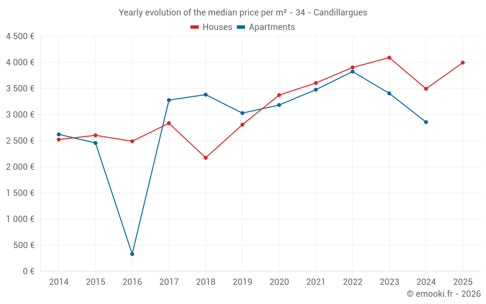 The median price on the 24 house transactions of the last 24 months in the municipality of Candillargues was 4 032 € per square meter for a median property value of 370 100 €. Over this period, 60% of transactions were between 3 143 and 4 619 € per square meter (from the 2nd to the 8th deciles).
