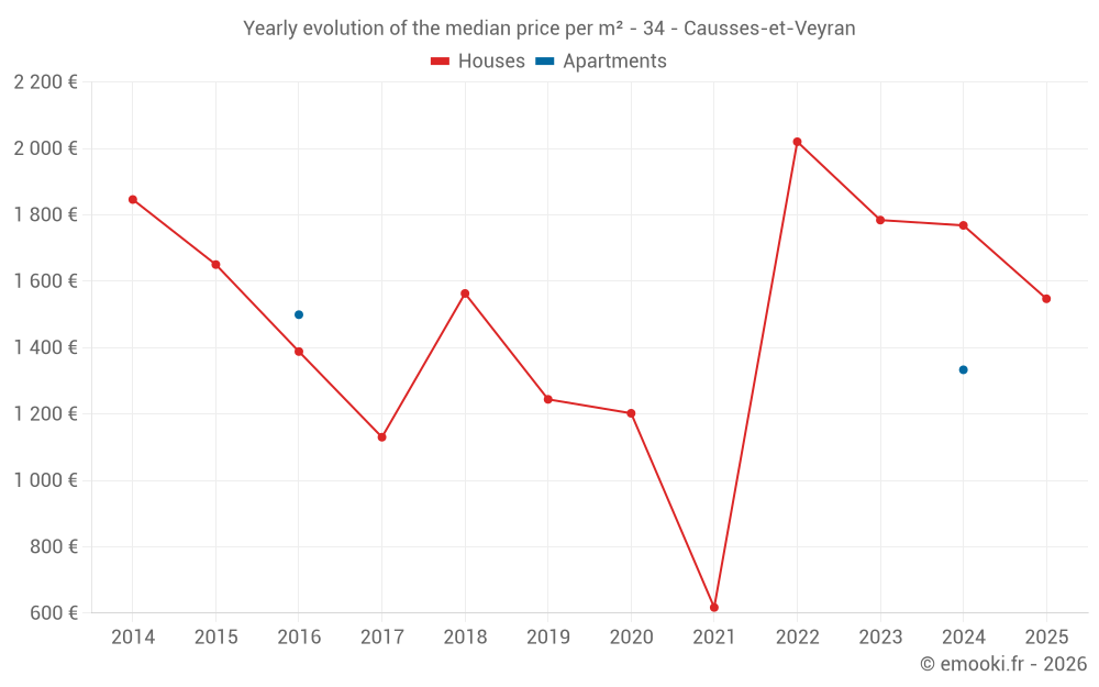 The median price on the 15 house transactions of the last 24 months in the municipality of Causses-et-Veyran was 1 890 € per square meter for a median property value of 227 600 €. Over this period, 60% of transactions were between 1 427 and 2 323 € per square meter (from the 2nd to the 8th deciles).