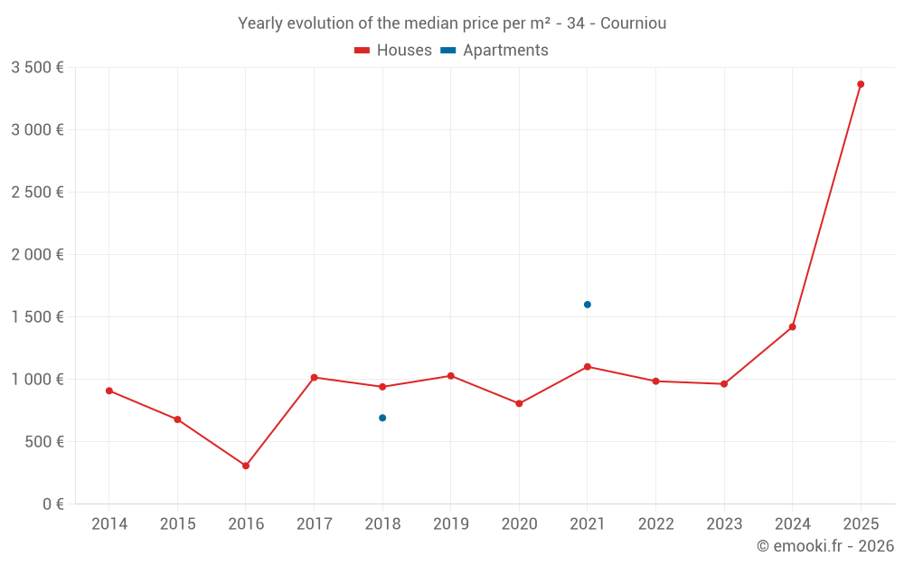 The median price on the 18 house transactions of the last 24 months in the municipality of Courniou was 1 204 € per square meter for a median property value of 109 500 €. Over this period, 60% of transactions were between 831 and 1 914 € per square meter (from the 2nd to the 8th deciles).