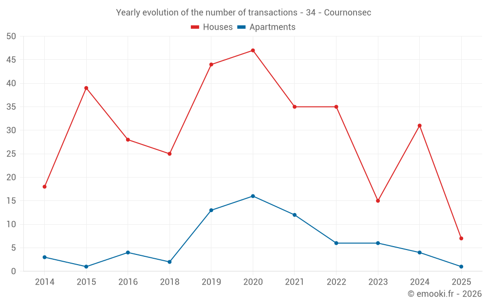 The median price on the 22 house transactions of the last 12 months in the municipality of Cournonsec was 3 032 € per square meter for a median property value of 340 000 €. Over this period, 60% of transactions were between 1 842 and 3 973 € per square meter (from the 2nd to the 8th deciles).