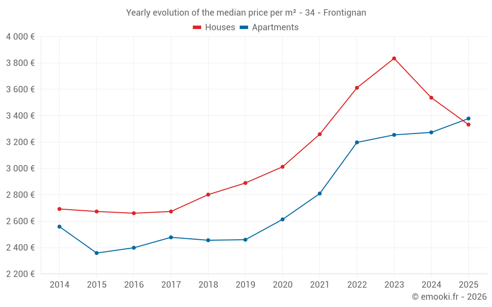 The median price on the 26 apartment transactions of the last 3 months in the municipality of Frontignan was 3 889 € per square meter for a median property value of 136 775 €. Over this period, 60% of transactions were between 2 492 and 5 436 € per square meter (from the 2nd to the 8th deciles).