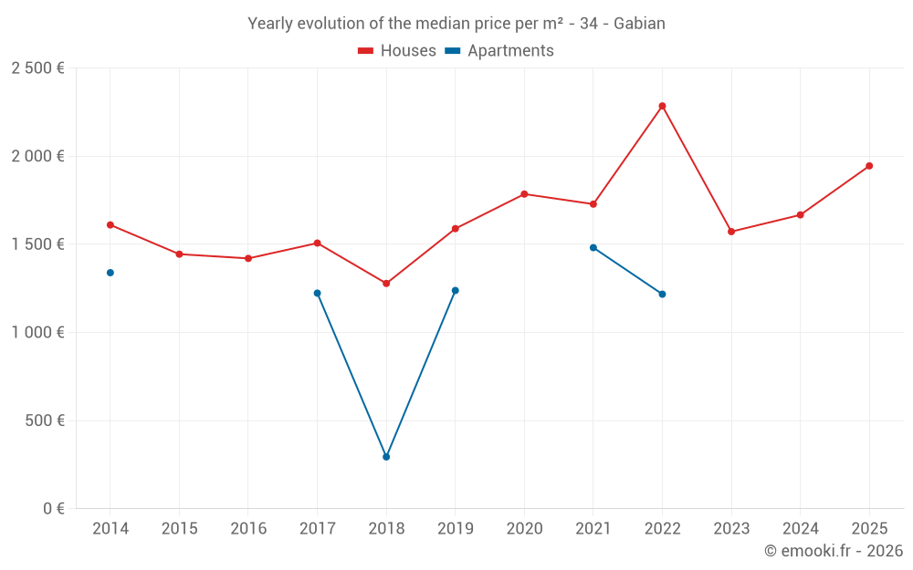 The median price on the 21 house transactions of the last 12 months in the municipality of Gabian was 1 769 € per square meter for a median property value of 112 240 €. Over this period, 60% of transactions were between 1 264 and 2 187 € per square meter (from the 2nd to the 8th deciles).