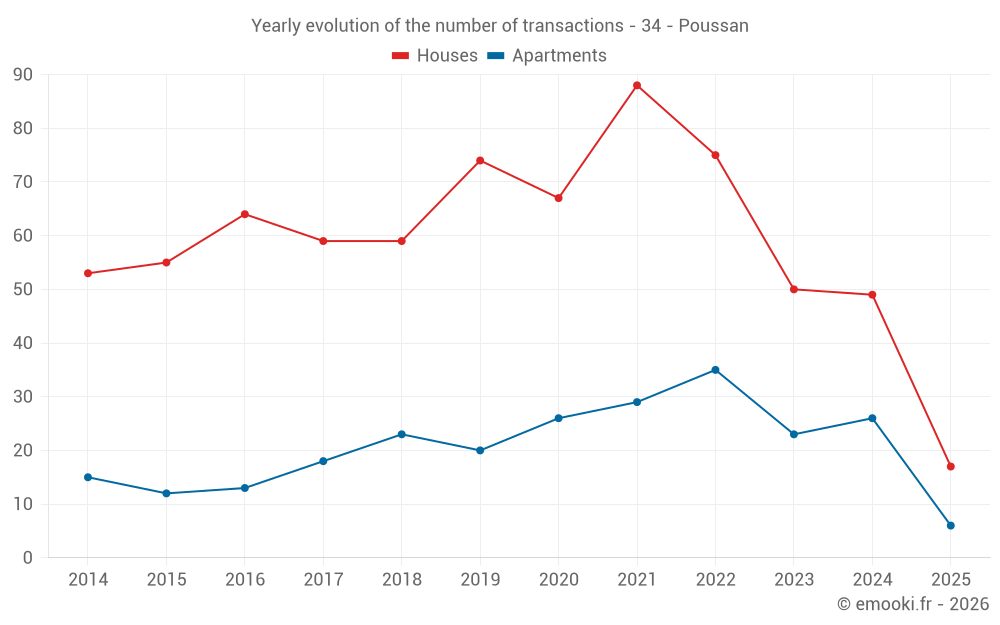 The median price on the 41 house transactions of the last 12 months in the municipality of Poussan was 3 373 € per square meter for a median property value of 303 500 €. Over this period, 60% of transactions were between 2 000 and 4 268 € per square meter (from the 2nd to the 8th deciles).