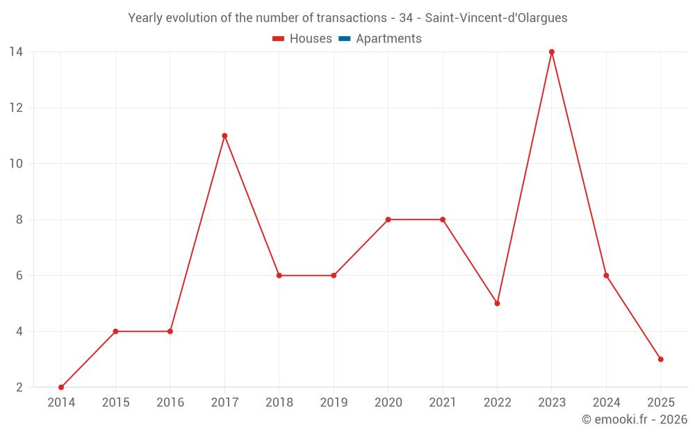 The median price on the 16 house transactions of the last 24 months in the municipality of Saint-Vincent-d'Olargues was 1 541 € per square meter for a median property value of 110 000 €. Over this period, 60% of transactions were between 833 and 2 372 € per square meter (from the 2nd to the 8th deciles).