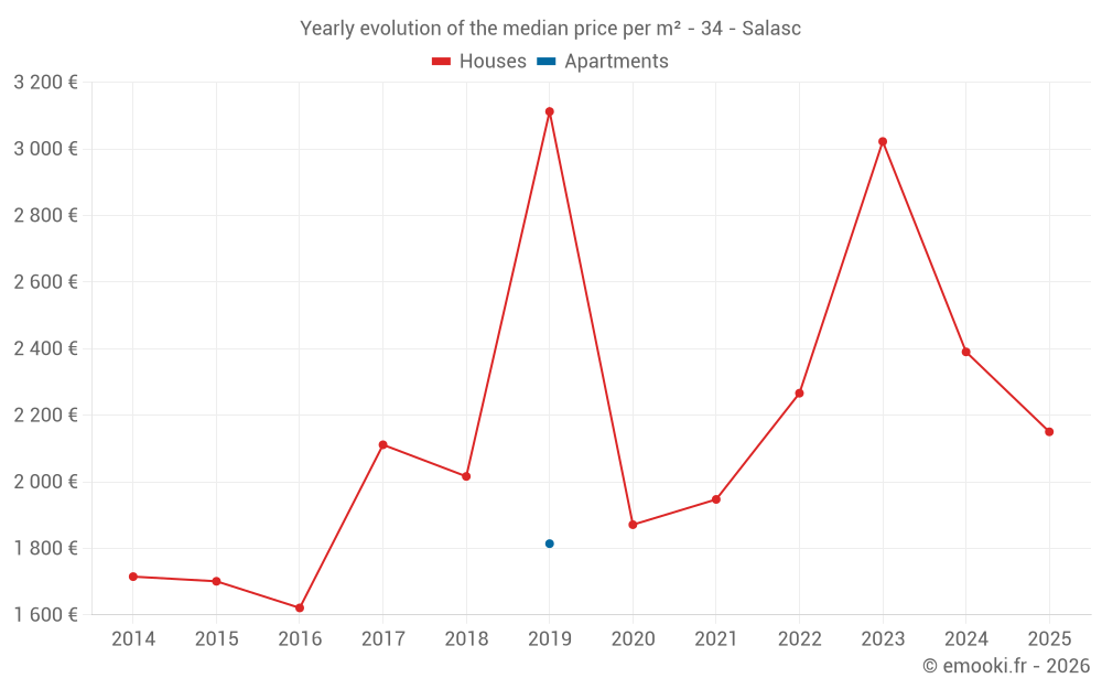 The median price on the 14 house transactions of the last 24 months in the municipality of Salasc was 2 312 € per square meter for a median property value of 233 900 €. Over this period, 60% of transactions were between 1 146 and 2 981 € per square meter (from the 2nd to the 8th deciles).