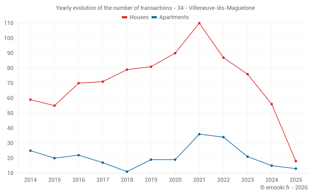 The median price on the 21 apartment transactions of the last 12 months in the municipality of Villeneuve-lès-Maguelone was 3 208 € per square meter for a median property value of 155 000 €. Over this period, 60% of transactions were between 2 436 and 3 730 € per square meter (from the 2nd to the 8th deciles).