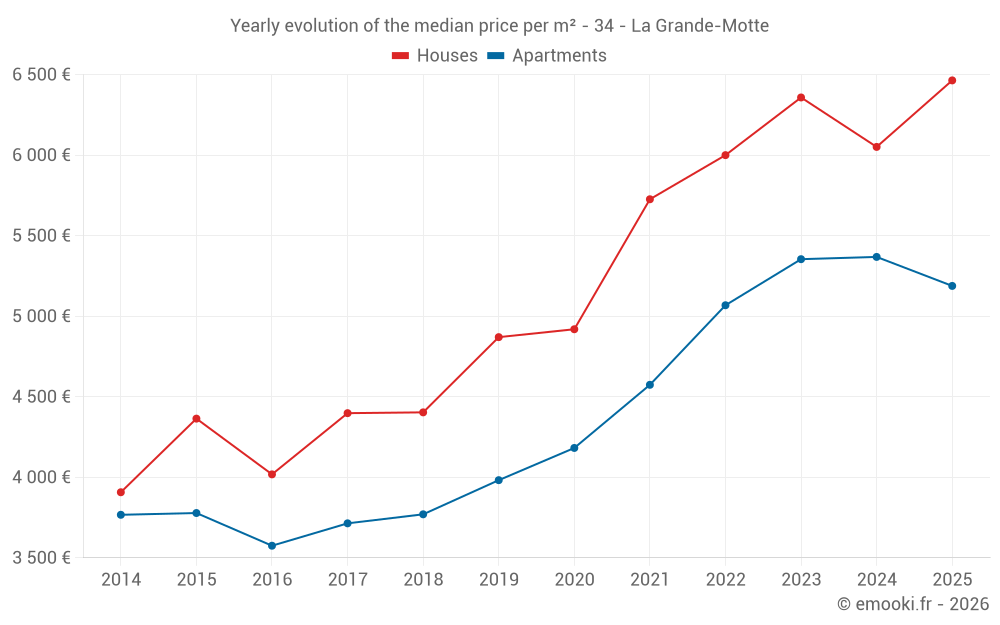 The median price on the 43 house transactions of the last 12 months in the municipality of La Grande-Motte was 6 267 € per square meter for a median property value of 490 000 €. Over this period, 60% of transactions were between 4 675 and 7 064 € per square meter (from the 2nd to the 8th deciles).