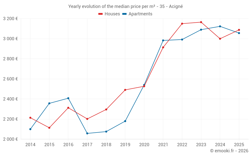 The median price on the 26 apartment transactions of the last 12 months in the municipality of Acigné was 3 056 € per square meter for a median property value of 207 500 €. Over this period, 60% of transactions were between 2 803 and 3 337 € per square meter (from the 2nd to the 8th deciles).
