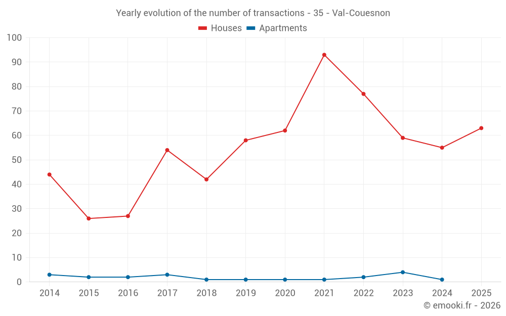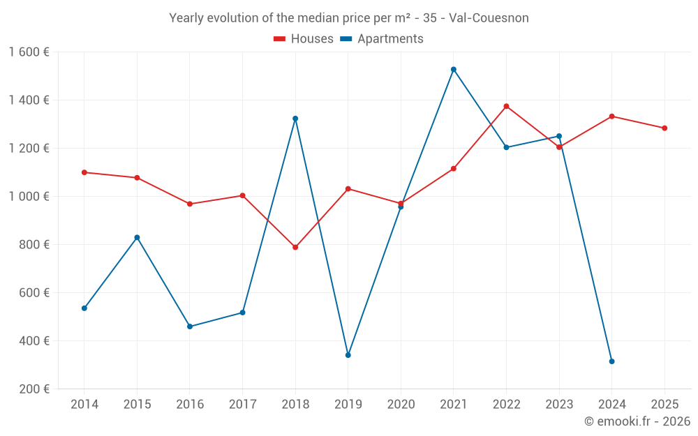 The median price on the 36 house transactions of the last 6 months in the municipality of Val-Couesnon was 1 052 € per square meter for a median property value of 106 500 €. Over this period, 60% of transactions were between 660 and 1 672 € per square meter (from the 2nd to the 8th deciles).